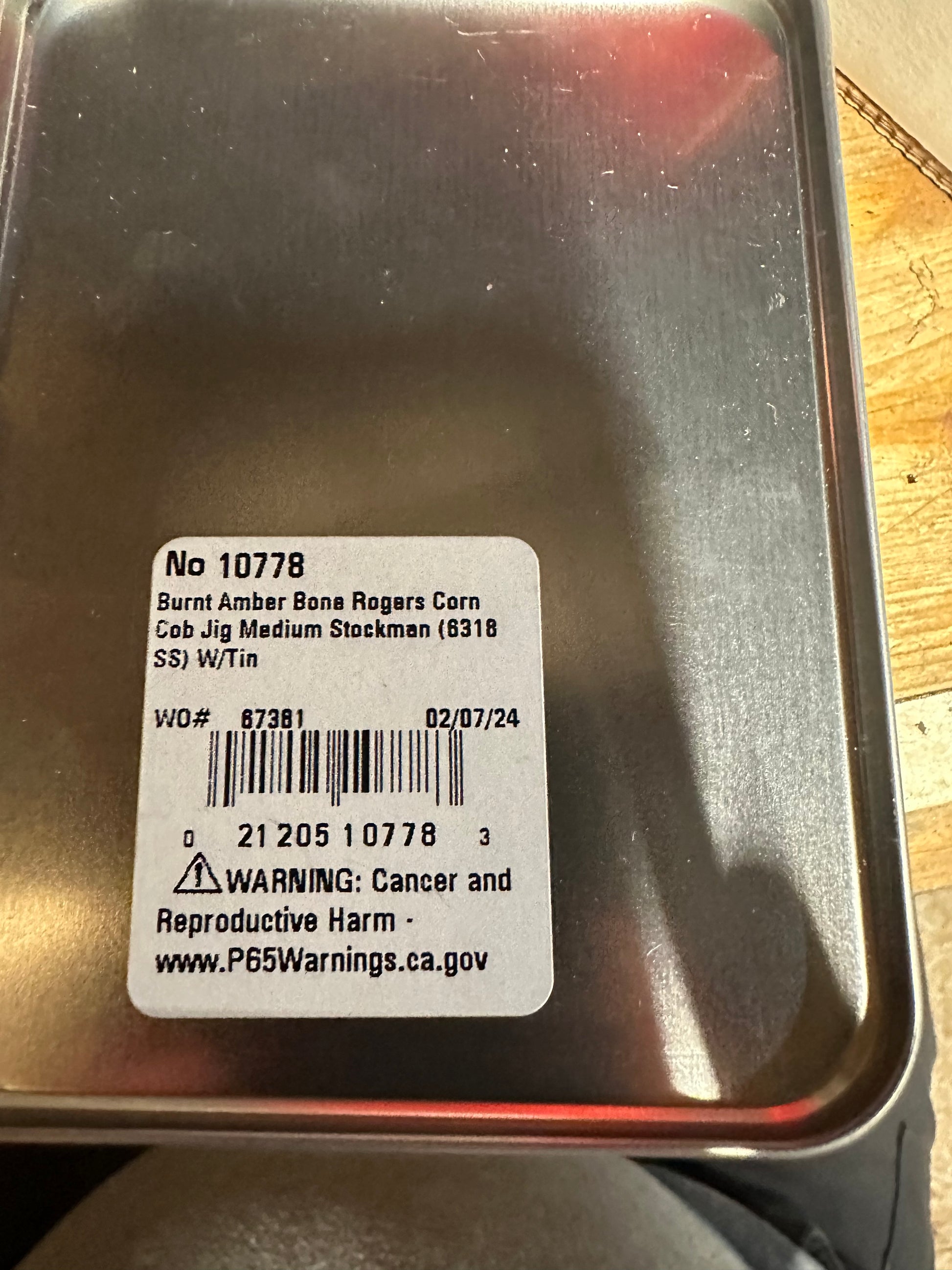 2024 Burnt Amber Bone Rogers Corn Cob Jig Medium Stockman (6318 SS) W/Tin