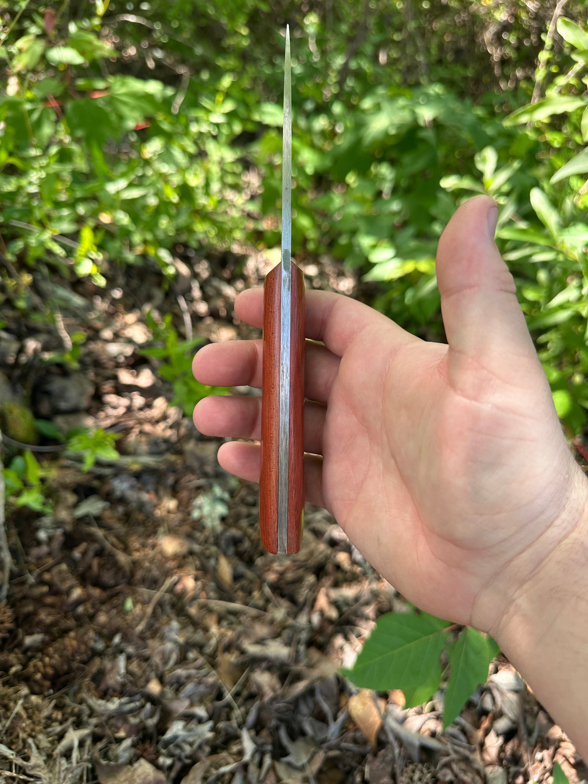 Does not come with sheath. Blade is sharpened with a 25 degree bevel.